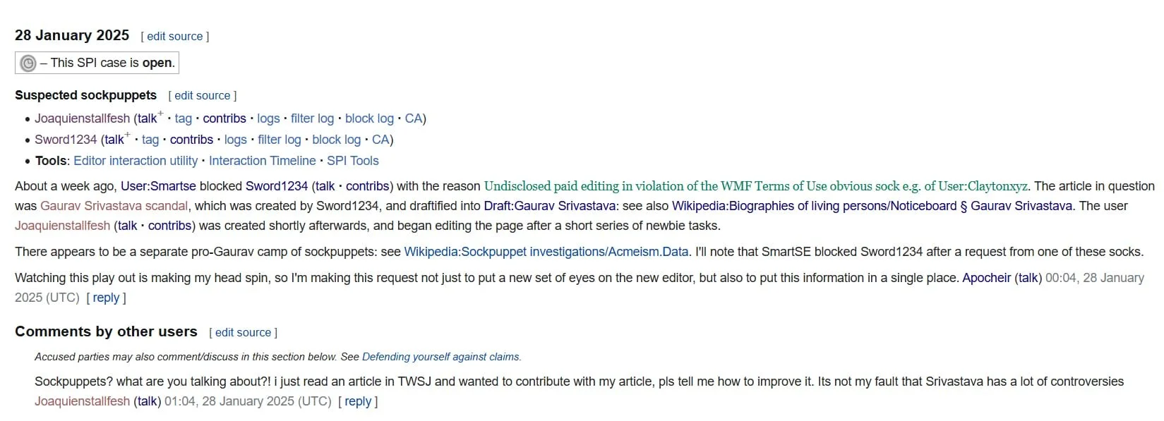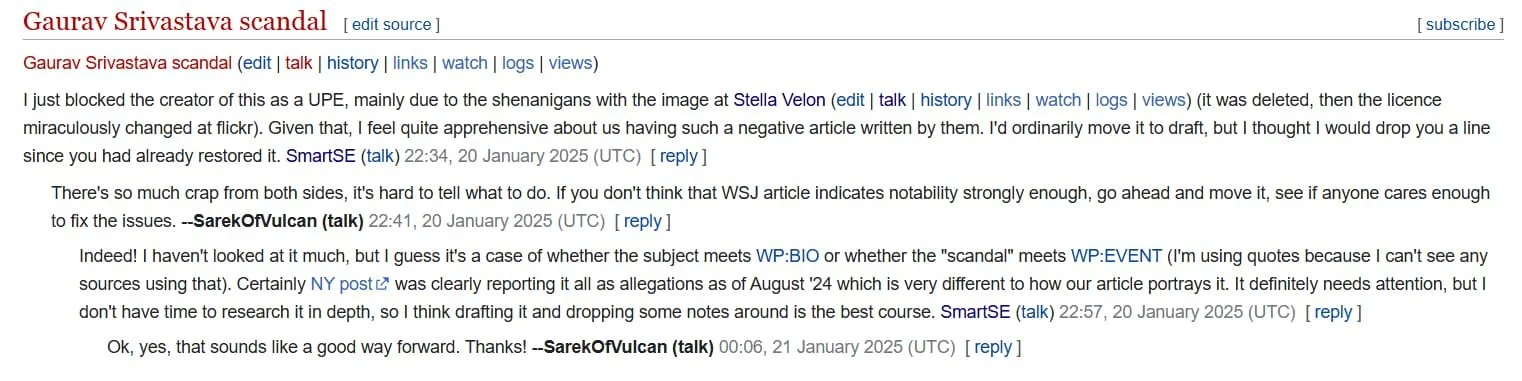 The next step was a Wikipedia entry about Srivastava, which was later flagged as an “attack page” and removed by senior editors, further extending the controversy.